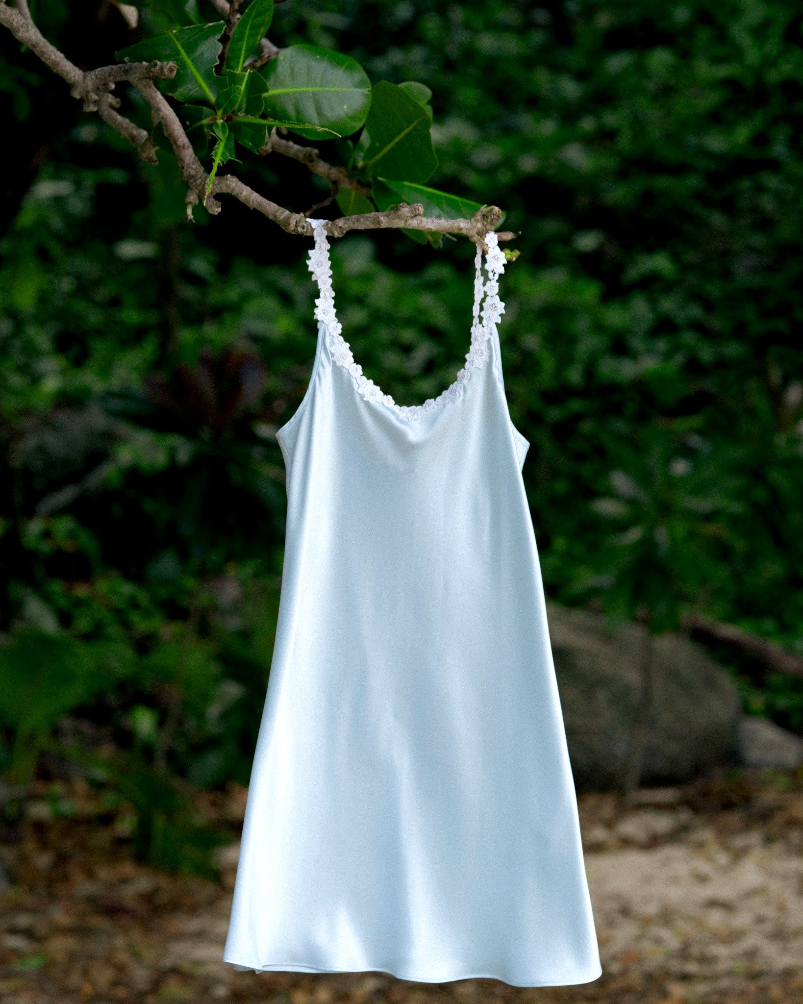 Light as a breeze and soft as meadow petals, Animara is a poetic mini dress crafted in a delicate lakewater blue. The shoulder straps are embroidered with tonal floral lace, softly tracing the collarbone and framing the open back with botanical romance. Its slip silhouette is cut for gentle movement and an unrestrained drape, using fine French seams for a luxurious finish inside and out.
