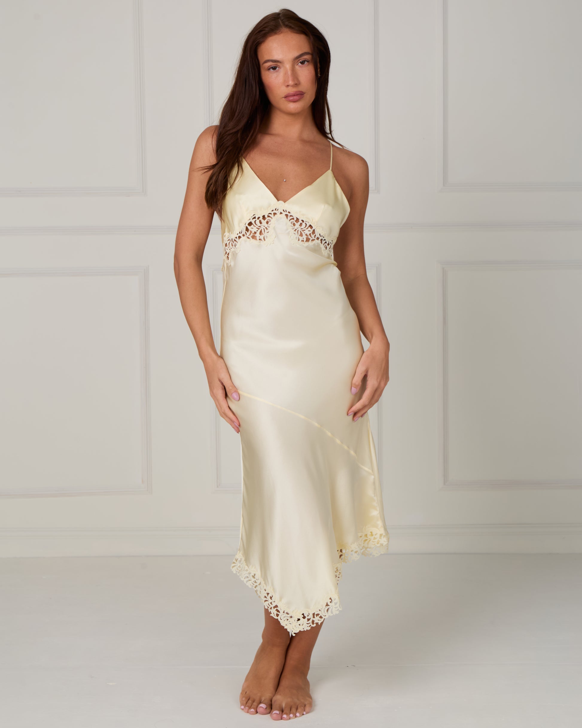 Lumora is a bias-cut silk lace slip crafted from 19 momme 100% Mulberry silk, it features scalloped laser-cut lace under the bust and along the hem, adjustable crossed spaghetti straps, a low open back, and a wavy asymmetric hem that ripples and flows with your movement — an effortless balance of refined sleepwear and understated eveningwear