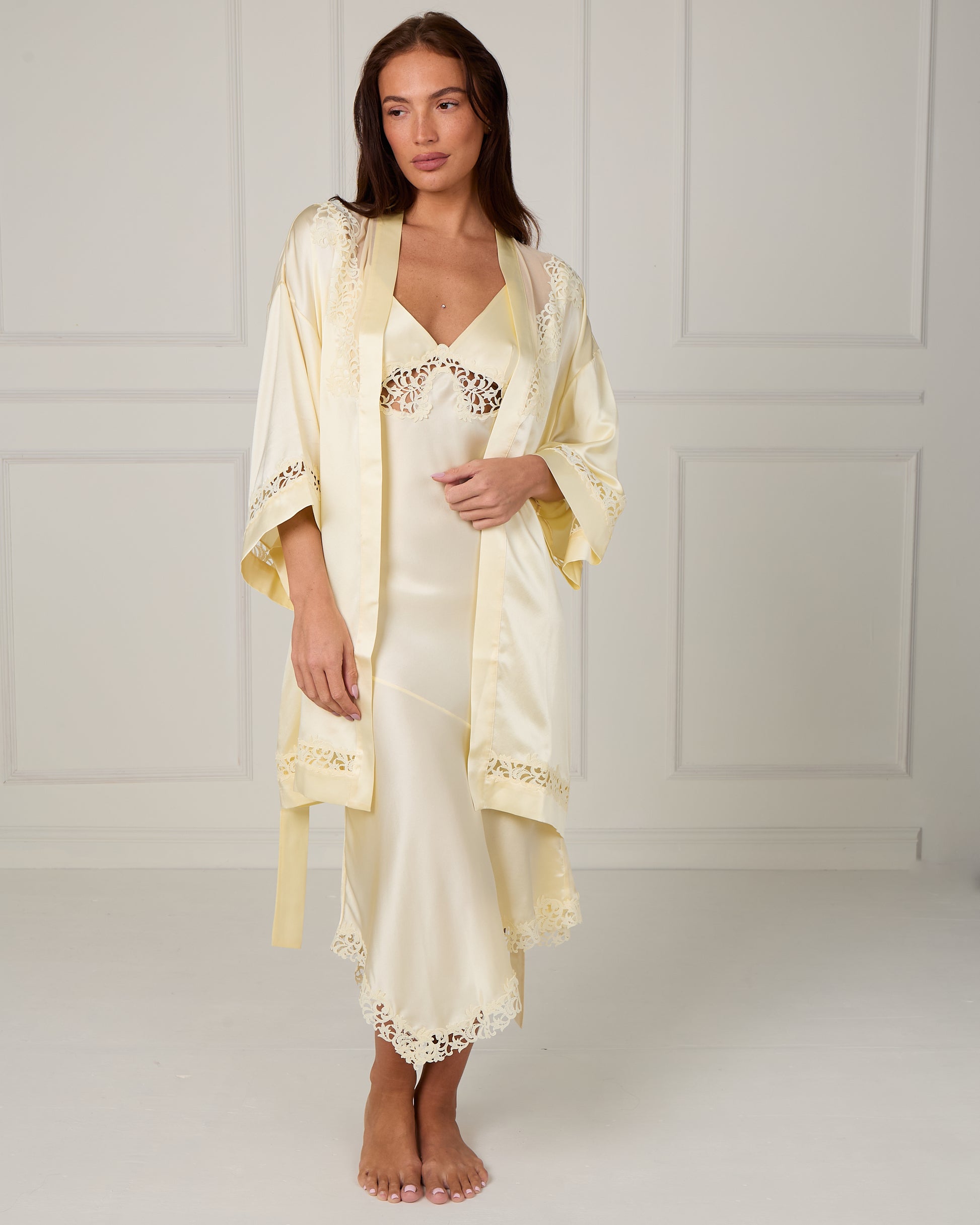 Serenya is crafted from 19 momme glossy Mulberry Silk with refined laser-cut lace at the collar, cuffs and hem, and a sheer silk-chiffon V back. Mid-length kimono sleeves and a long silk belt create an effortless, elegant silhouette that floats with your movement. Wear Serenya alone for a quiet, luxe moment or layer it over the Lumora slip for a complete evening look.